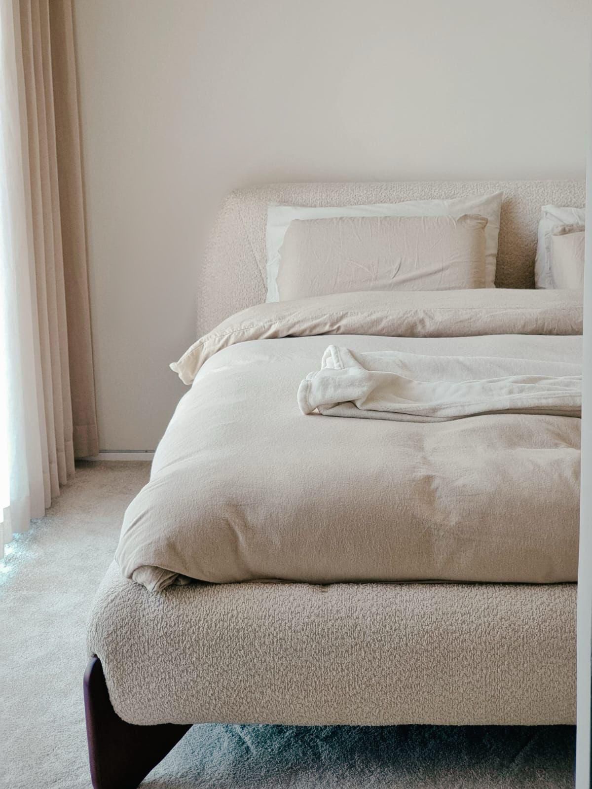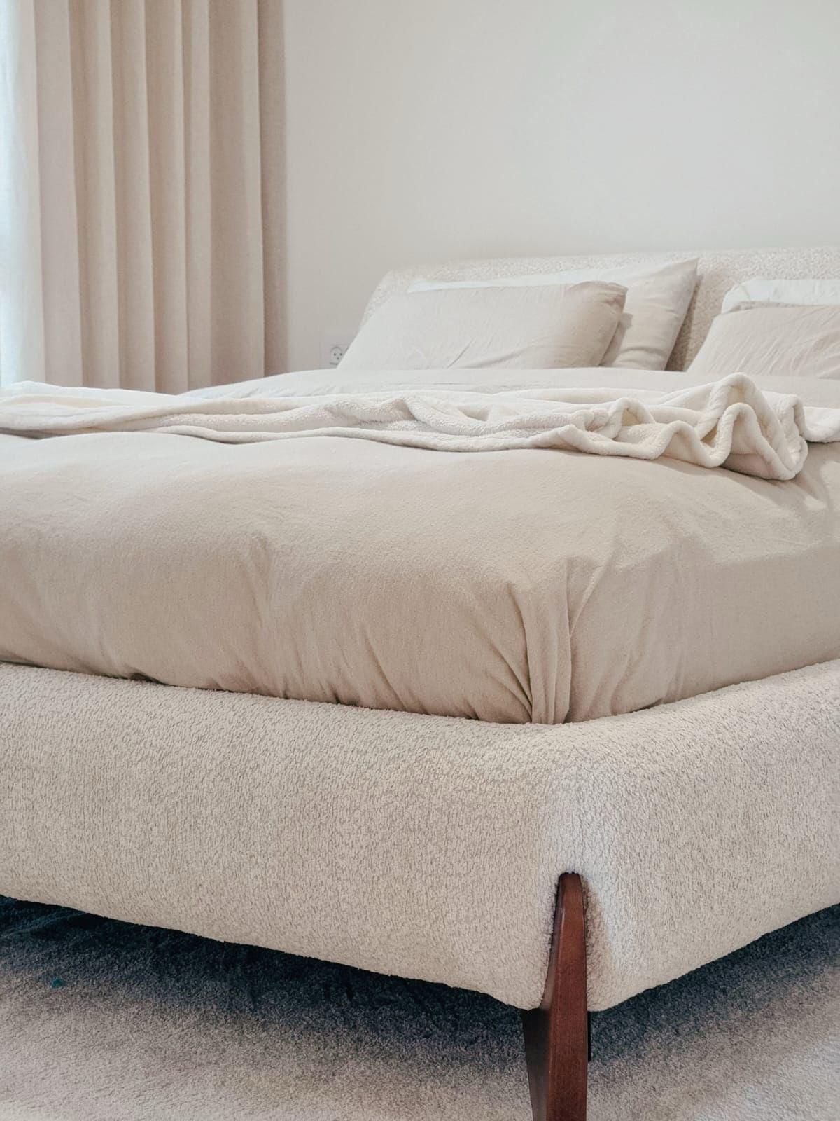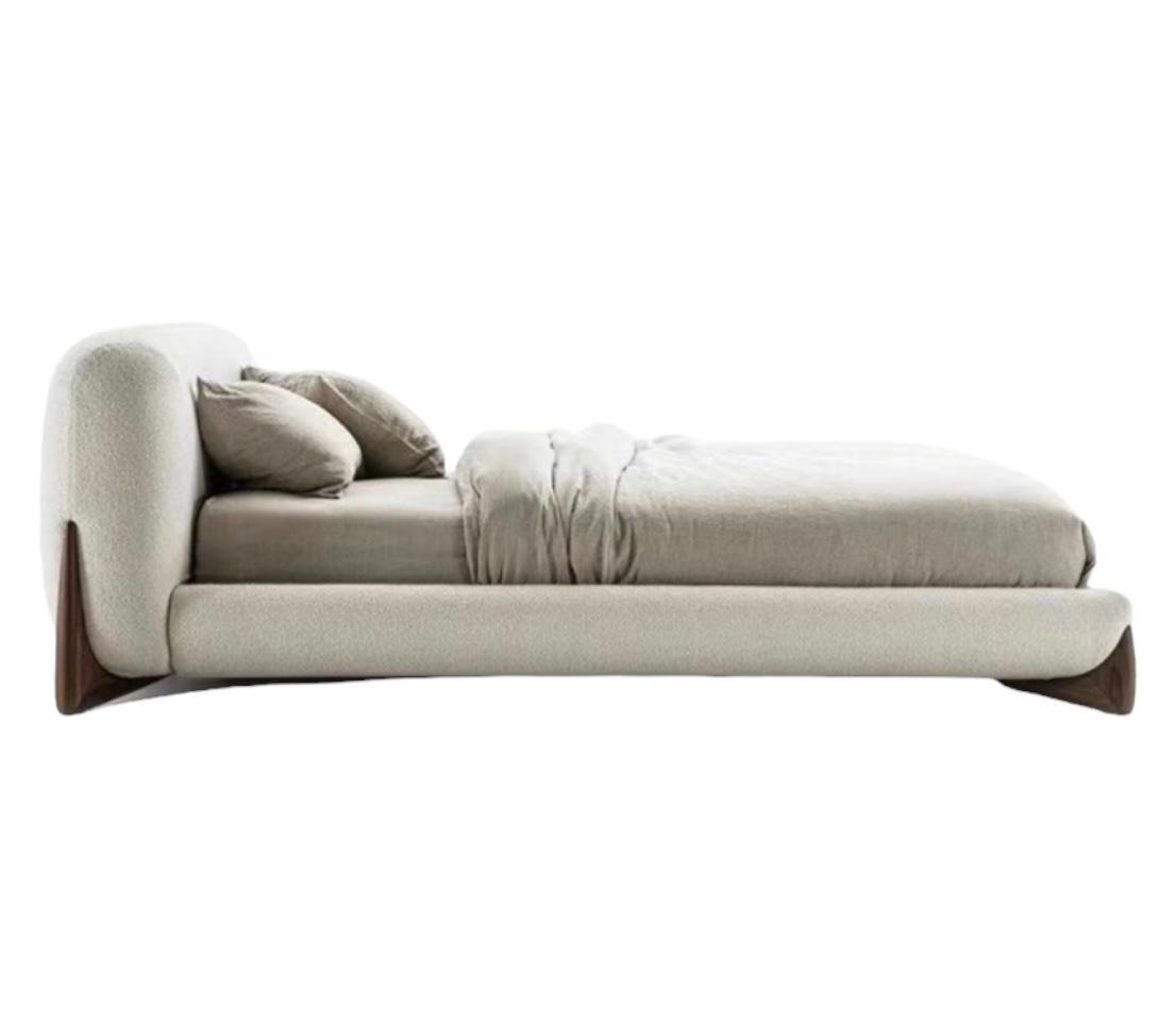 מיטת Lorance , מיטת שינה קלאסית וסופר טרנדית עשויה בד בוקלה עדין בשילוב רגלי עץ גושני בגוון אגוז. גב המיטה עבה ומעוגל שנותן מראה קוזי ונוח.