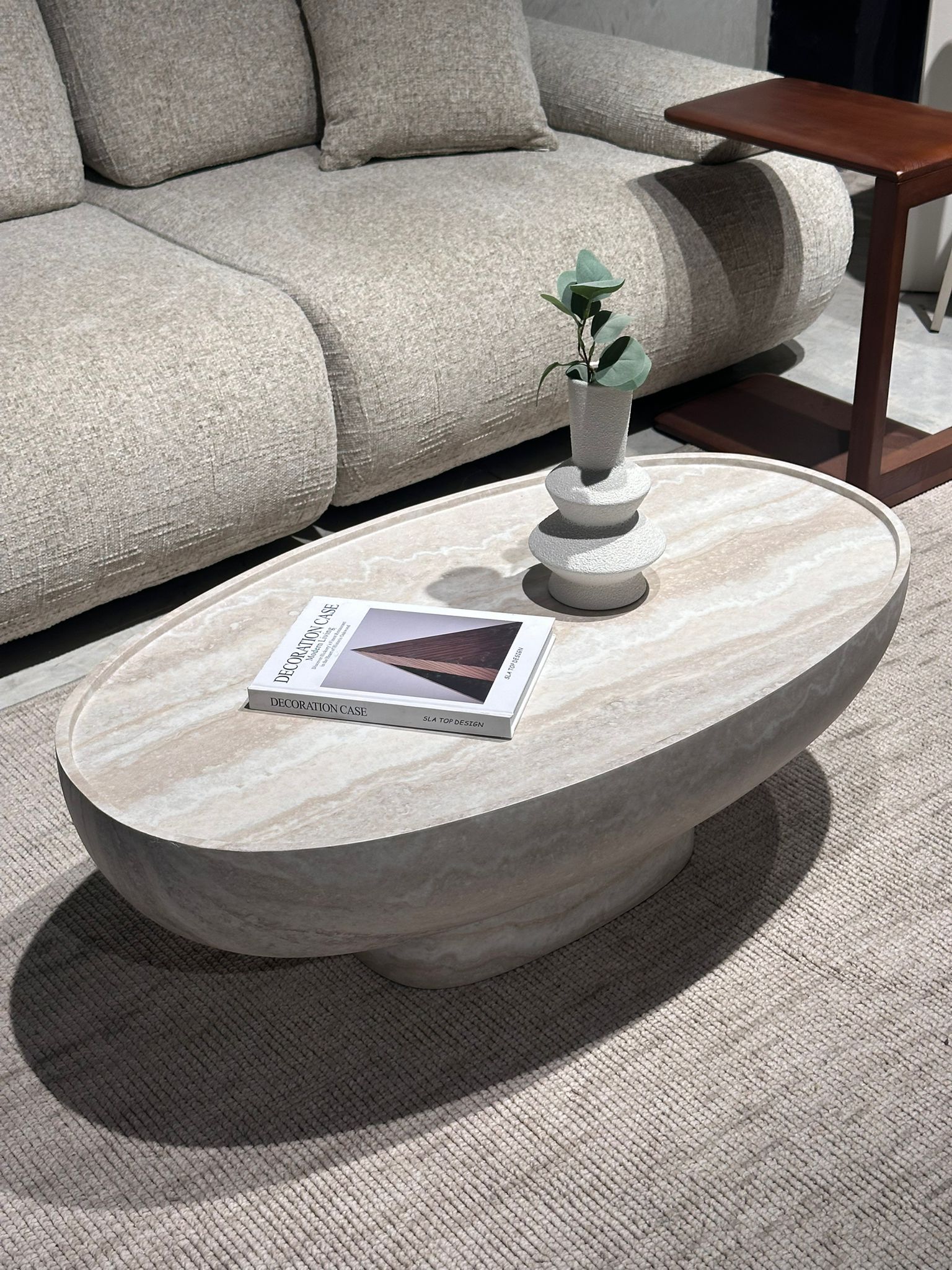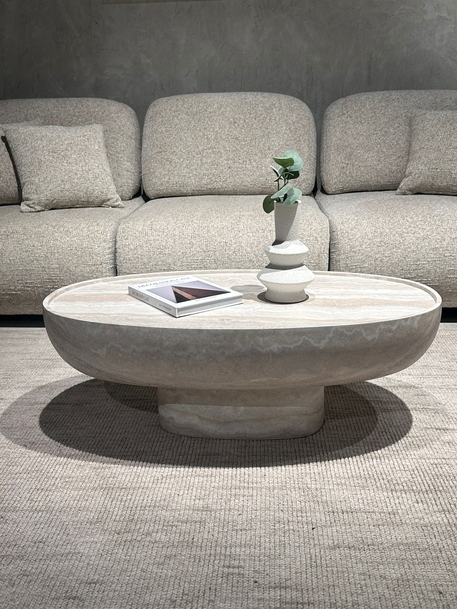 שולחן סלון אובלי על רגל בגימור דמוי שיש טרוונטין במראה מדוייק, שמתאים לכל חלל בבית שלכם.