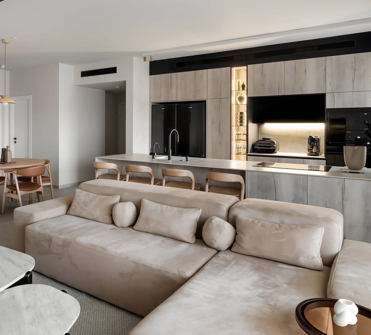 ספה מודולרית מורכבת משלושה חלקים עשויים מעץ מלא וריפוד בד אריג,