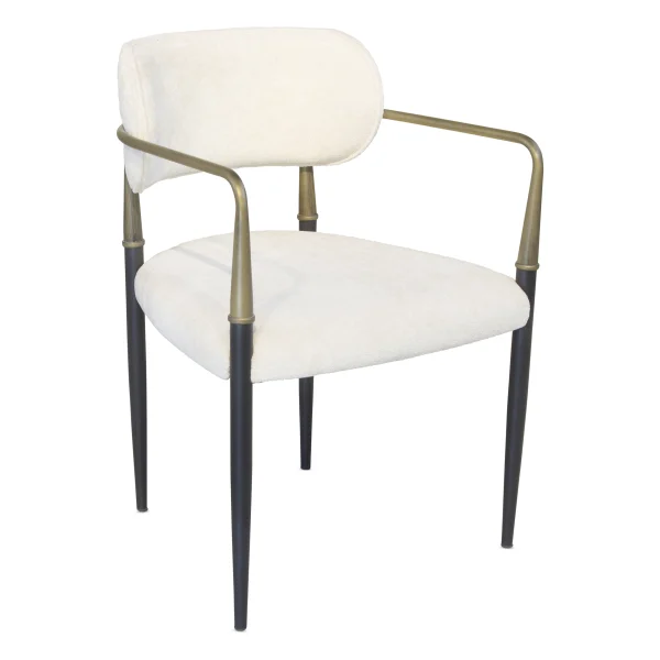 כסא מדגם Bani שילוב עיצובי של מושב מרופד בד אריג וידיות ברזל זהב מוברש ורגלי ברזל מושחרות