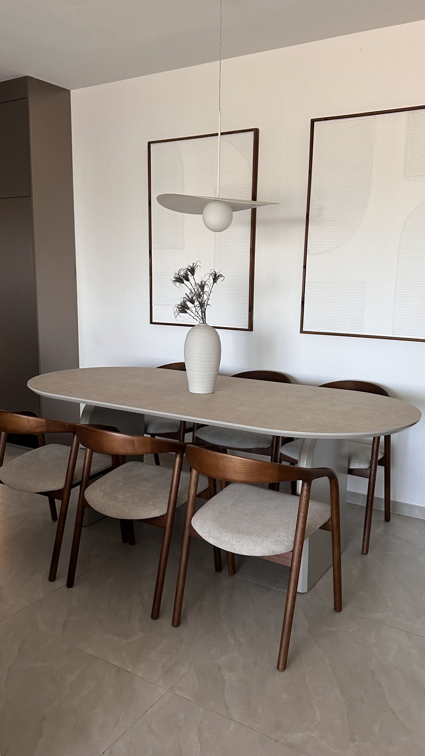 שולחן פינת אוכל אובלי 200 ס״מ פלטה עליונה עשויה פורמייקת דמוי בטון, רגליים גאומטריות בצורת קשת