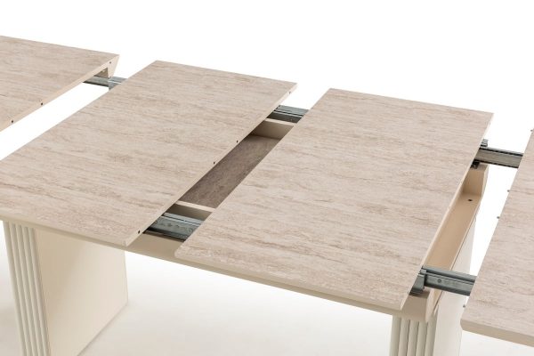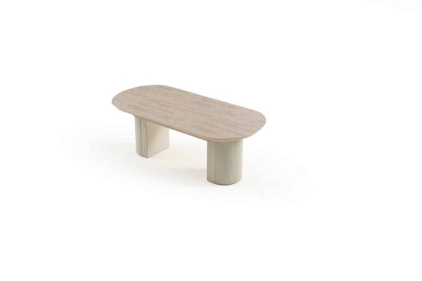 שולחן אוכל מדגם Ellipti הוא שולחן אוכל בגוון טרוונטין בשילוב רגלי לייסטים בגימור מעוגל שיוצרות אווירה מושלמת נפתח לשולחן ענק ופרקי מאוד לאירוח