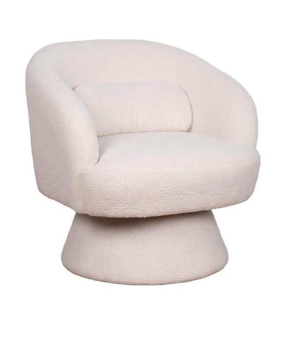 כורסא מסתובבת בצבע לבן עשויה בד בוקלה עדין. הכורסא נישאת על פודיום עדין. כורסא שיוצרת אווירה עכשווית בעיצוב אורבני